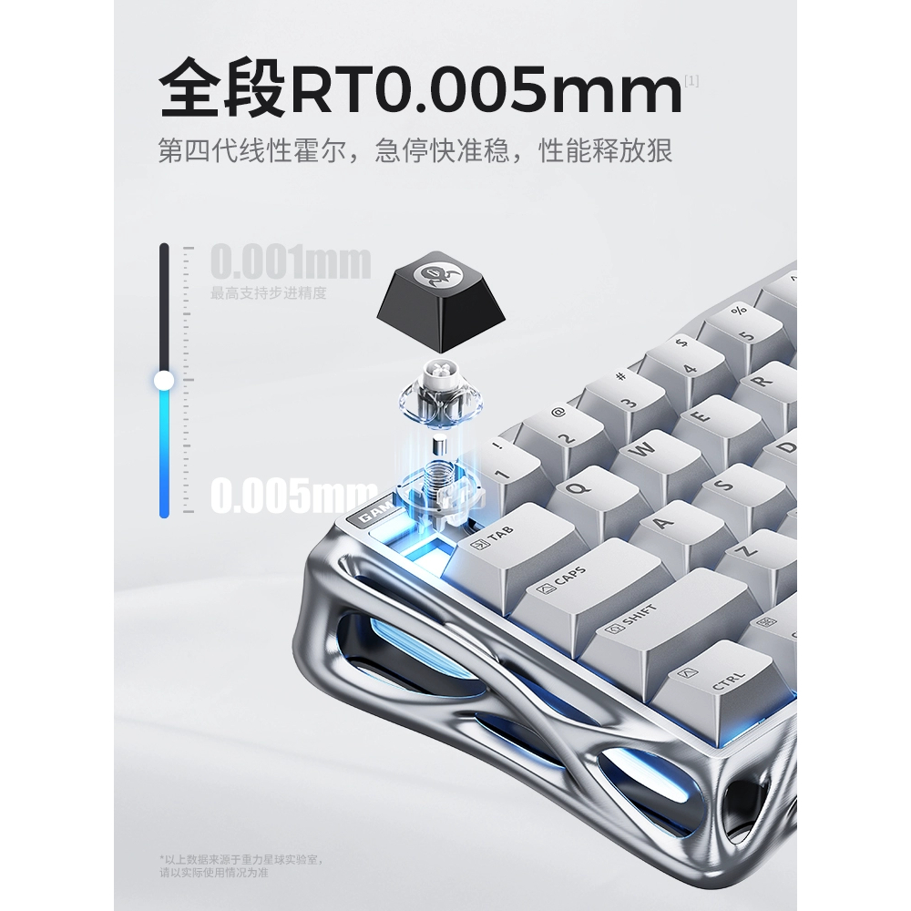 có thể điều chỉnh Độ sâu cò có thể tùy chỉnh (tăng dần 0,005mm, 0,005mm–3,5mm) để phù hợp với phong cách chơi—nông cho các combo nhanh, sâu cho các đầu vào chính xác. Cò nhanh động Điều chỉnh động các điểm kích hoạt/hủy kích hoạt dựa trên hành trình phím (không phải giới hạn đặt trước), cho phép lặp lại phím nhanh như chớp. Ưu tiên lần nhấn phím cuối cùng Ưu tiên phím được nhấn cuối cùng để thay đổi hướng mượt mà; Giải quyết tình trạng nhấn đồng thời bằng cách ưu tiên lực nhấn sâu hơn. Chế độ kích hoạt nhanh Loại bỏ hiện tượng “bám dính” phím bằng cách thiết lập lại tức thì khi di chuyển lên trên, cho phép nhấn lại và chuyển đổi đầu vào nhanh hơn. Kết cấu nhôm Khung nhôm chắc chắn (cho độ bền cao). Thiết kế có thể thay nóng Cho phép thay đổi công tắc (không cần hàn) với công tắc hiệu ứng Hall từ tính; tương thích với một số mẫu TTC và Gateron. Bọt cách âm 5 Giảm thiểu rung động khi nhấn phím, mang lại âm thanh sắc nét hơn và cảm giác gõ mượt mà hơn. 16 chế độ, hệ thống kép, đèn RGB đa vùng: 16 chế độ động có thể tùy chỉnh, điều khiển hai vùng (phím + đèn bên xung quanh) và điều chỉnh sắc độ/độ bão hòa/độ sáng.