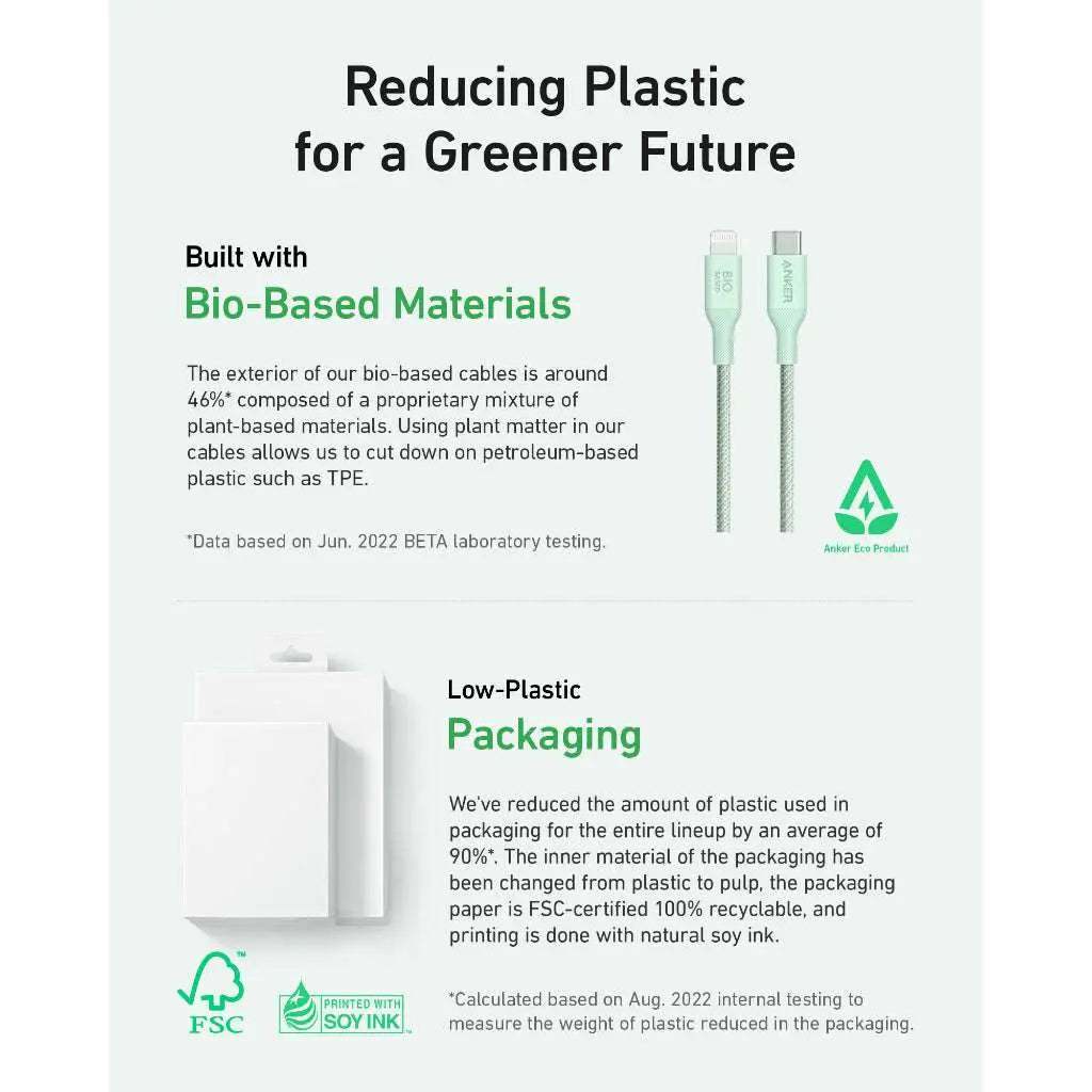 Bên ngoài thân cáp và vỏ đầu nối được làm bằng nylon gốc sinh học, trong khi bao bì được làm bằng giấy có thể tái chế 100% và in bằng mực đậu nành.
