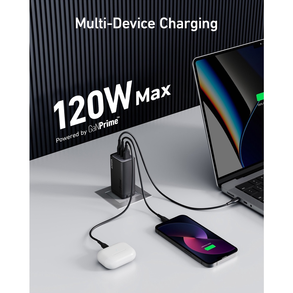 – Cấp nguồn cho 3 thiết bị cùng lúc: Với 2 cổng USB-C và một cổng USB-A, bạn có thể sạc điện thoại, máy tính bảng và máy tính xách tay của mình cùng một lúc từ một bộ sạc duy nhất. Kết nối một thiết bị duy nhất để sạc ở mức tối đa 100W