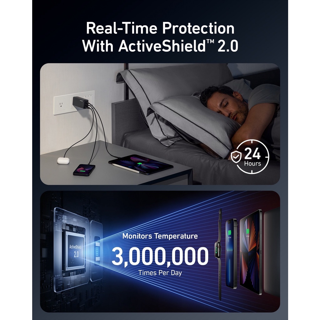 – ActiveShield 2.0: Công nghệ độc quyền của Anker tăng cường khả năng bảo vệ bằng cách theo dõi nhiệt độ một cách thông minh hơn 3 triệu lần mỗi ngày và điều chỉnh công suất đầu ra để bảo vệ các thiết bị được kết nối của bạn.