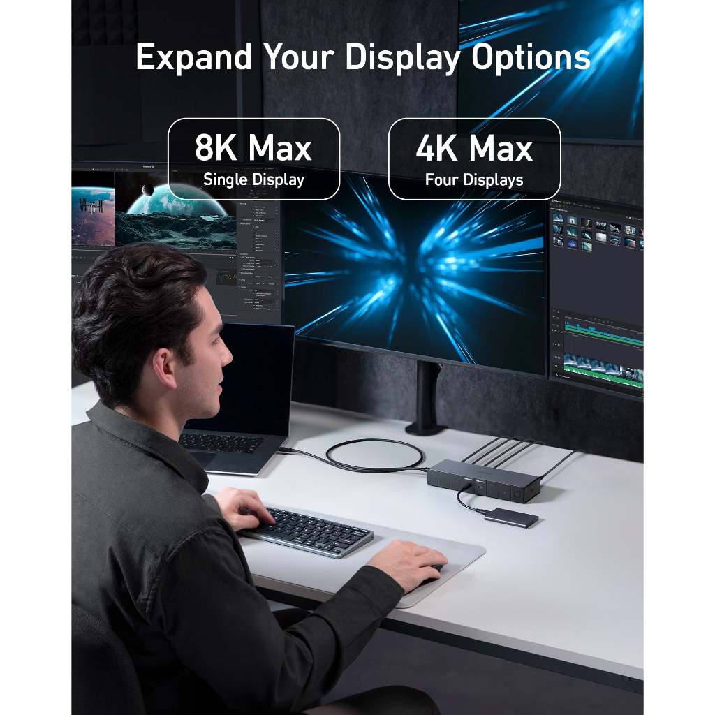 Với tổng cộng 12 cổng, bạn có thể hiển thị phương tiện tới tối đa 4 màn hình, truyền tệp với tốc độ lên tới 10 Gbps, sạc máy tính xách tay và các thiết bị khác cùng lúc và kết nối Internet.