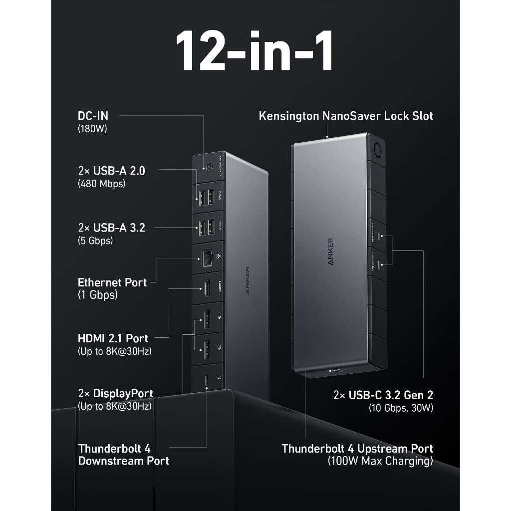 Mở rộng 12 trong 1: Được trang bị cổng Thunderbolt 4 upstream công suất tối đa 100W, cổng Thunderbolt 4 downstream, hai cổng USB-C (10 Gbps, 30W), hai cổng USB-A 5 Gbps, hai cổng USB-A 480 Mbps, một cổng Ethernet, một cổng HDMI 2.1 8K và hai cổng DisplayPort.