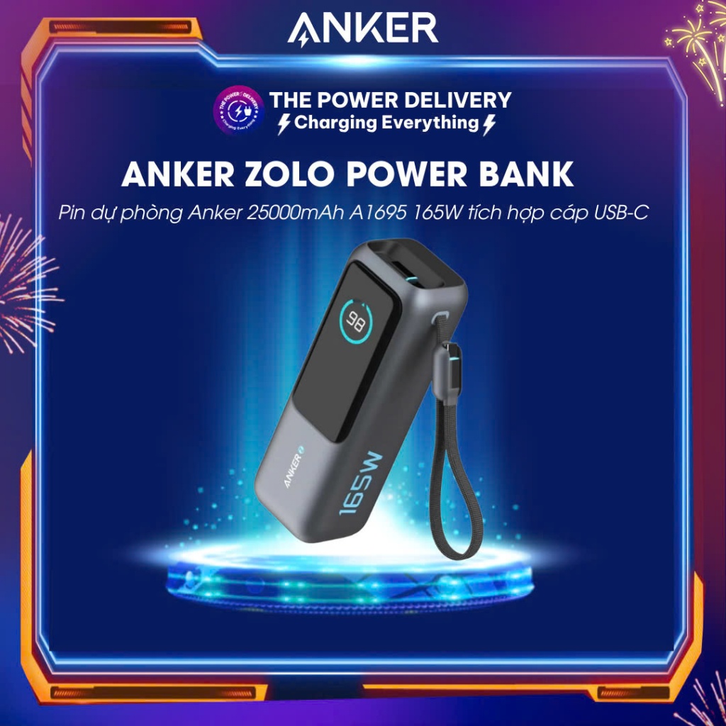 Pin dự phòng Anker Zolo Power Bank 25K A1695 công suất 165W có cáp USB-C tích hợp và có thể thu gọn