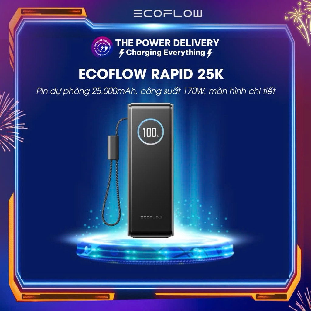 Pin Dự Phòng EcoFlow RAPID, Dung Lượng25.000mAh, Công Suất 170W, Cáp Built-In 100W, Màn Hình Chi Tiết