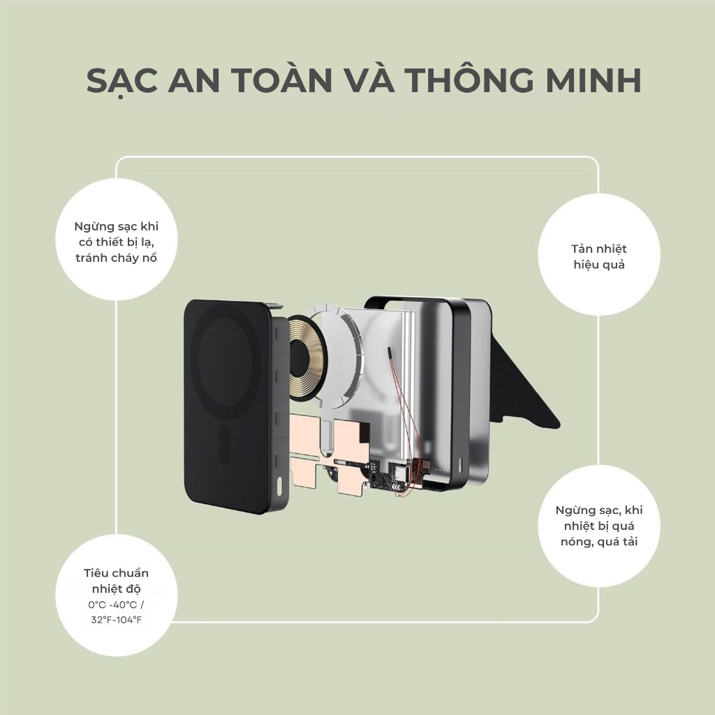 An toàn, thời trang & hiệu suất cao – Được thiết kế để giữ nhiệt độ mát mẻ khi sạc, Power Bank Qi2 có cơ chế tản nhiệt tối ưu để kiểm soát nhiệt độ trong khoảng 0°C-35°C – kể cả khi sạc nhanh. Chân đế tích hợp có thể điều chỉnh đến 120° để bạn xem thiết bị rảnh tay ở bất kỳ đâu.