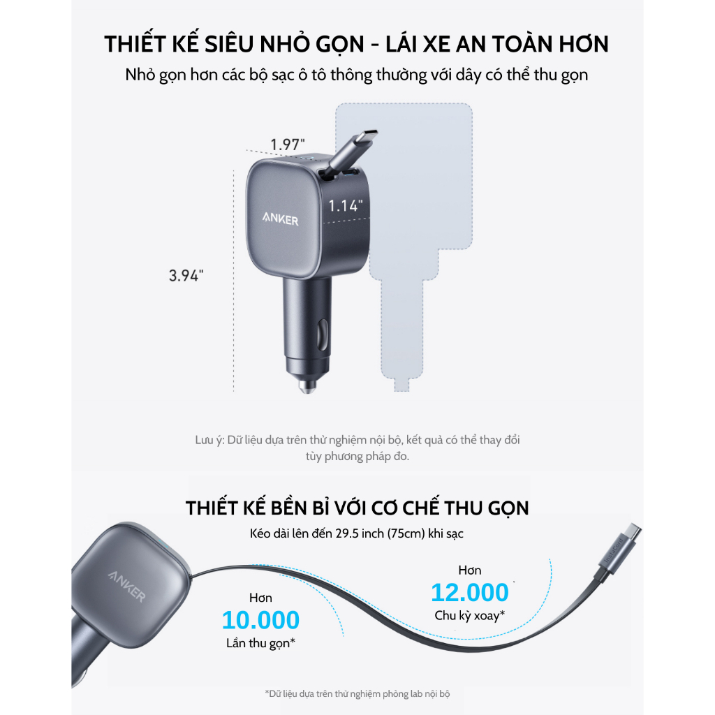 Tẩu sạc nhanh Anker A2738 75W nằm ở thiết kế cáp sạc có thể thu gọn “Pull, Charge, and Store”. Chỉ cần kéo nhẹ cáp ra hơn 2 inch (5cm) để sử dụng và kéo nhẹ rồi thả ra để thu gọn cáp vào trong thân sạc. Cơ chế này không chỉ mang lại sự tiện lợi tối đa mà còn giữ cho không gian nội thất xe hơi luôn gọn gàng, ngăn nắp, loại bỏ hoàn toàn tình trạng rối dây phiền toái.