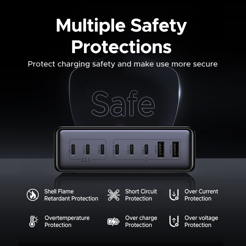 Sạc Ugreen X766 được trang bị 6 cổng USB-C và 2 cổng USB-A, cho phép sạc đồng thời tối đa 8 thiết bị mà vẫn đảm bảo tốc độ tối ưu. Mỗi cổng USB-C hỗ trợ công suất lên đến 100W, phù hợp cho các thiết bị hiệu suất cao như MacBook Pro, Dell XPS, HP Spectre hay iPad Pro. Đây là điểm nổi bật giúp Sạc Ugreen 200W vượt trội hơn so với các dòng sạc truyền thống.